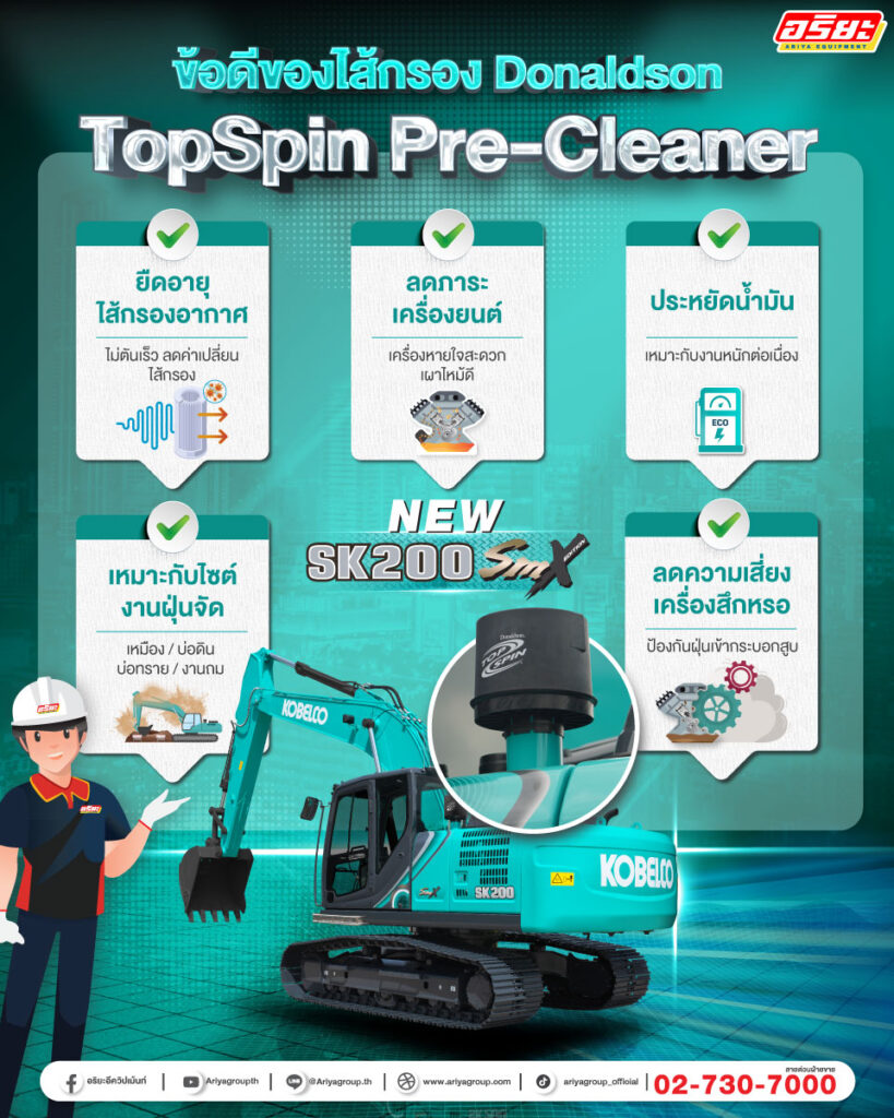 ในงานก่อสร้าง บ่อดิน บ่อทราย หรือเหมือง ที่มีฝุ่นจำนวนมาก การดูแลให้อากาศที่เข้าสู่เครื่องยนต์สะอาดเป็นสิ่งสำคัญต่อประสิทธิภาพและอายุการใช้งานของรถขุด Kobelco หนึ่งในอุปกรณ์ที่ช่วยลดภาระของไส้กรองอากาศหลักได้อย่างมีประสิทธิภาพคือ Top Spin หรือ “ท็อปสปิน”